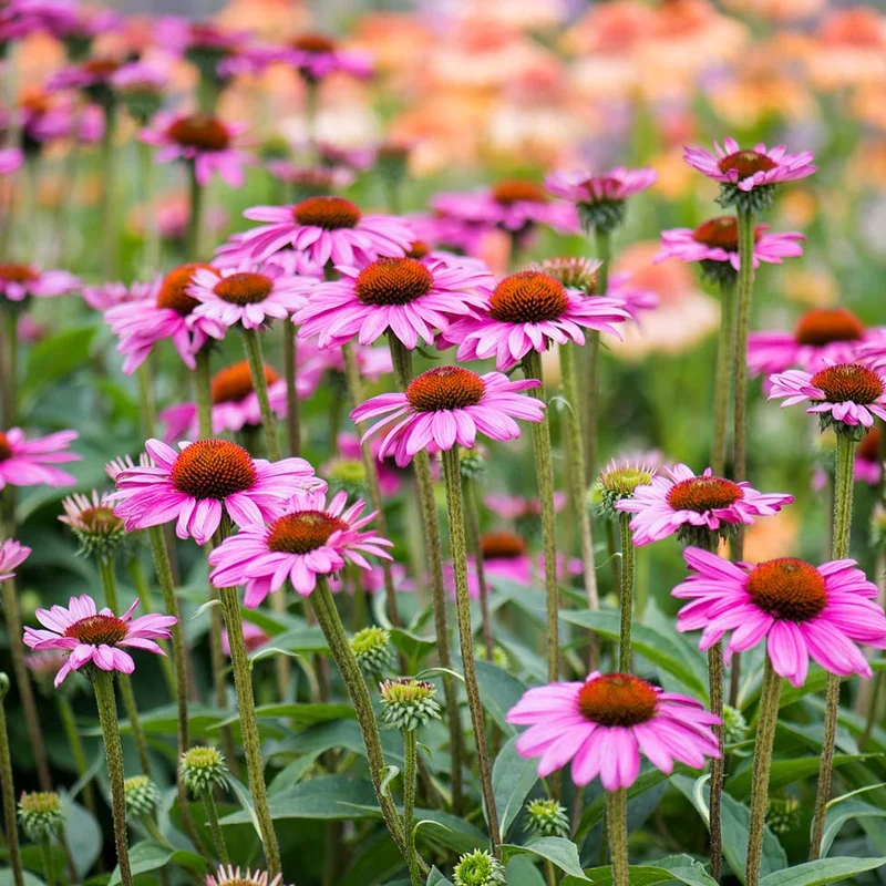 Well-regarded for attractive flowers and potential health benefits. Large, showy flowers with prominent raised centers (cones) and drooping petals in purple, pink, white, and orange. Leaves are often lance-shaped, coarse, and hairy.