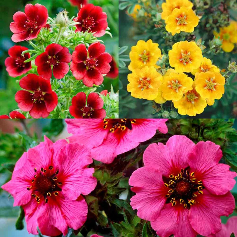 Typically have compound leaves with several small leaflets and produce five-petaled saucer-shaped flowers in yellow, white, pink, orange, or red. Flowers are often borne in clusters.